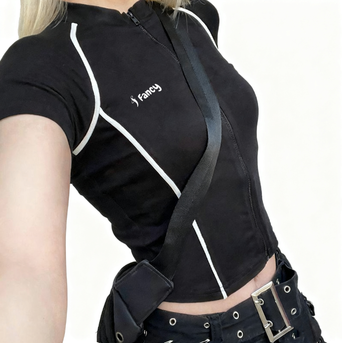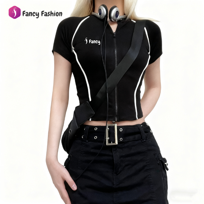 Fancy Women’s Y2K Zip-Up Crop Top Black with White Piping Short Sleeve Slim Fit Retro Streetwear